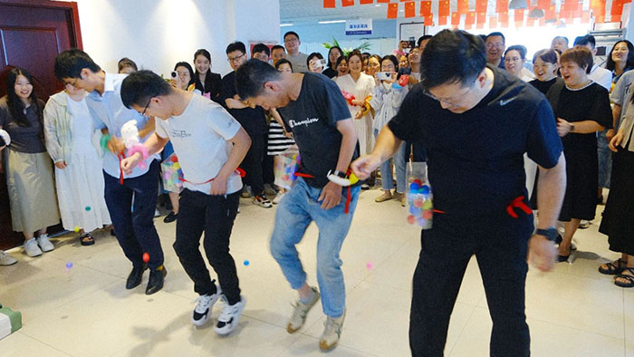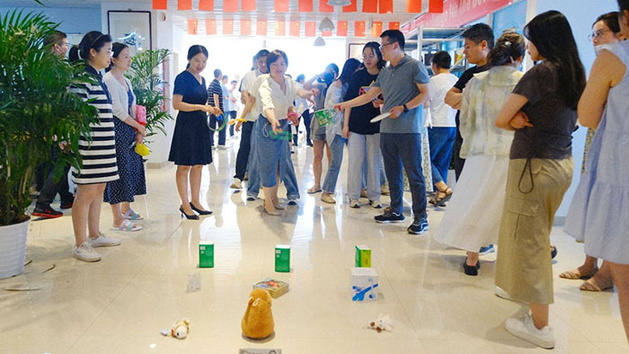 接著近半年入職的小伙伴們輪流登臺(tái)做自我介紹,并分隊(duì)開始進(jìn)行丟沙包。這邊用力擲出,那邊左閃右避,不時(shí)做出高難度跳躍動(dòng)作。觀眾們的加油聲高過一陣又一陣,現(xiàn)場(chǎng)洋溢著青春活力氛圍。