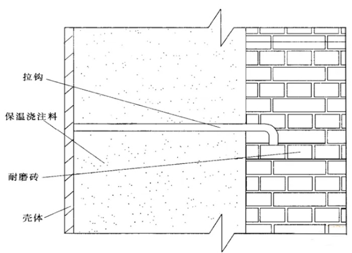 如圖5所示,為耐磨磚十保溫澆注料形式,同樣為解決膨脹每一定間隔留有膨脹縫,即耐磨磚與耐磨磚之間留有2mm的灰漿縫,耐磨磚上有用于拉鉤固定的凹槽,而且為了把耐磨磚的質(zhì)量分層傳遞到鋼殼上,并在適當高度設(shè)有高溫熱強鋼制的托架。這種形式適合于鋼殼形狀較復(fù)雜及其他不適合保溫磚的部位。
