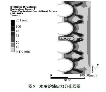 焚燒爐余熱發(fā)電鍋爐水冷壁配置厚度70 ~ 110mm 耐火可塑料或者澆注料,使用后會(huì)出現(xiàn)銷釘頭端面以外的耐火材料分層并脫落,脫落區(qū)域附近有細(xì)小裂紋。根據(jù)圖9 所示水冷爐壁應(yīng)力模擬分析可知,高溫條下,金屬錨固件的熱膨脹大于耐火材料的,在耐火材料與金屬銷釘界面應(yīng)力較大區(qū)域,大量銷釘共同作用使耐火材料產(chǎn)生分層,導(dǎo)致耐火材料脫落。