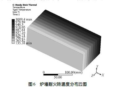 焚燒爐運(yùn)行過(guò)程中爐墻受熱,爐墻內(nèi)、外溫度存在差異。爐墻耐火磚模擬分析的溫度分布云圖如圖6 所示,構(gòu)成爐墻的碳化硅磚由內(nèi)部到外部存在較大的溫度梯度。工作面與非工作面溫度的差異使耐火磚向火面產(chǎn)生的膨脹比背火面的大。同時(shí),焚燒爐內(nèi)不同燃燒區(qū)域爐墻溫度分布不均,使?fàn)t墻在溫度較高的部位膨脹量較大。由于爐墻受爐體尺寸的約束,使整個(gè)爐墻產(chǎn)生較大的內(nèi)應(yīng)力,溫度越高的區(qū)域產(chǎn)生的內(nèi)應(yīng)力越大,這導(dǎo)致高溫區(qū)爐墻有向爐內(nèi)凸起、鼓包的趨勢(shì)。爐墻鼓包、凸起還與超負(fù)荷運(yùn)營(yíng)、工藝溫度控制、起停爐頻次、操作水平以及爐墻設(shè)計(jì)有關(guān)。