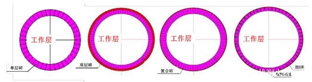 回轉(zhuǎn)窯焚燒爐非常關(guān)鍵設(shè)備即為回轉(zhuǎn)窯本體, 因其是一種動(dòng)態(tài)運(yùn)轉(zhuǎn)設(shè)備,對內(nèi)襯結(jié)構(gòu)設(shè)計(jì)要求較高,首先要確保耐火內(nèi)襯在動(dòng)態(tài)高溫狀態(tài)運(yùn)行下整體內(nèi)襯的穩(wěn)定性,防止耐火磚掉磚、抽簽等問題。對于危廢回轉(zhuǎn)窯系統(tǒng)而言,由于轉(zhuǎn)速比較慢,一般在1轉(zhuǎn)/分以下,可以根據(jù)廠房設(shè)計(jì)和節(jié)能要求選擇單層磚、雙層磚、復(fù)合磚和整體澆注等不同結(jié)構(gòu), 如圖3所示?;剞D(zhuǎn)窯耐火材料總厚度一般是250~300mm不等,其中工作層耐火磚材質(zhì)一般根據(jù)處理溫度和危廢種類不同,可以選擇高鋁質(zhì)、剛玉莫來石質(zhì)以及鉻鋯剛玉質(zhì)耐火材料等。