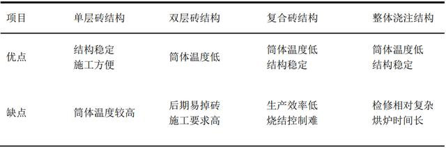 以上幾種設(shè)計(jì)方案優(yōu)缺點(diǎn)如表1所示。相比較而言, 耐火磚方案檢修和更換方便, 受環(huán)境和人為因素影響較小?,F(xiàn)在新建項(xiàng)目回轉(zhuǎn)窯基本都是室外設(shè)計(jì), 隨著提產(chǎn)和環(huán)保要求,采用單層結(jié)構(gòu)穩(wěn)定性較好, 高溫區(qū)可以考慮凹槽復(fù)合磚方式,降低外壁溫度。而且從防腐蝕角度, 筒體外壁溫度控制在160~320℃區(qū)間,比較合理。